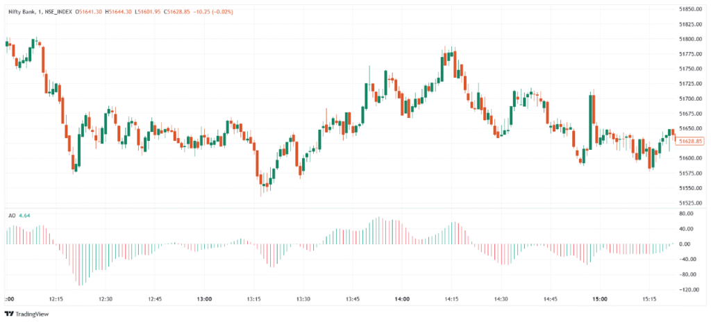 - AO Histogram → Bars plotted based on the difference between 5-SMA and 34-SMA of median price.