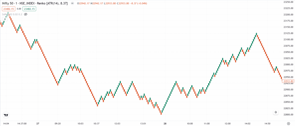 - Uses bricks of a fixed price size instead of time-based plotting.