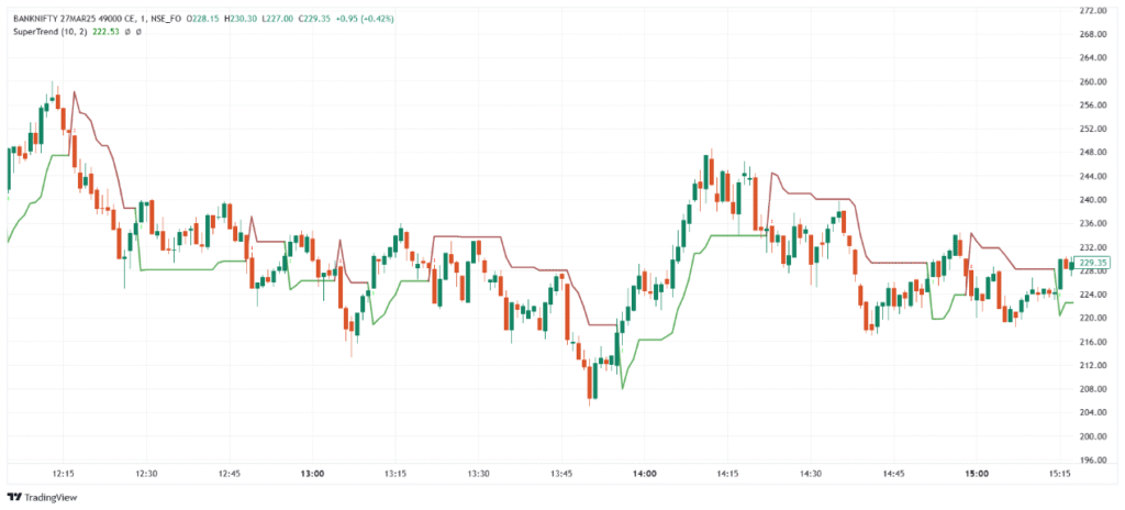 - Trailing Stop Strategy → Use Supertrend line as a dynamic stop-loss to lock in profits.